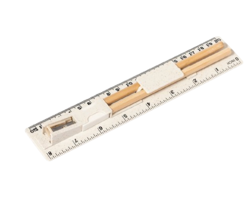 Set de 5 piezas fabricado en caña de trigo. Incluye 2 lápices de madera con mina negra y cuerpo cilíndrico blanco; goma y sacapuntas. Presentado en estuche/regla de 20 cm/8 pulgadas, con compartimentos para los distintos elementos del set. Presentado individualmente en una bolsa de papel blanca.